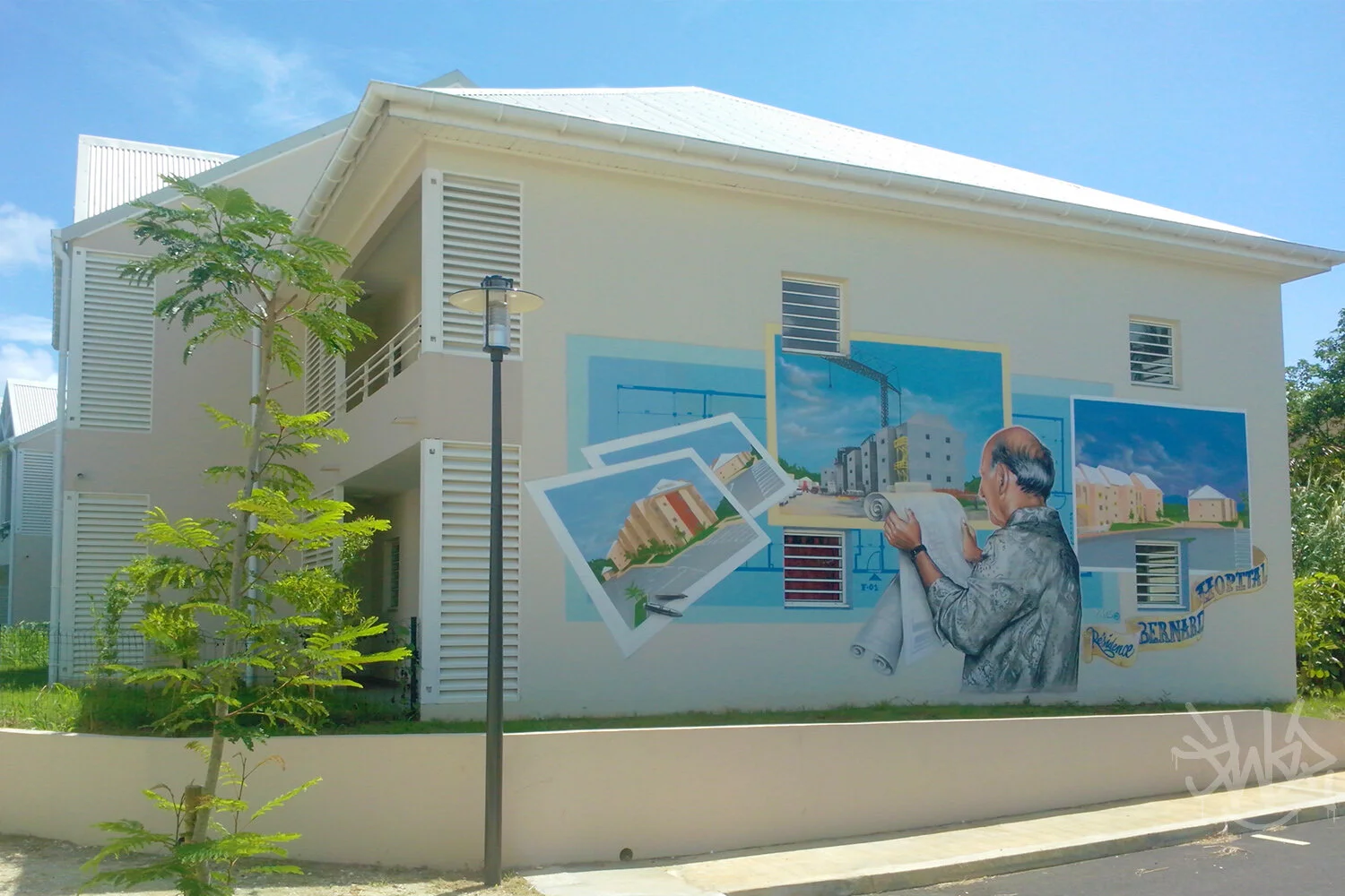 I was the exclusive concept designer and painter for this entire project. In charge of elaborating a global concept for the entire residential complex, I focused on developping themes that were specific to the region or neighborhood: science, sports, nature, fruits and vegetables, notables of the island of Guadeloupe... Facades and communal spaces such as stairwells, corridors and back yards were are thoroughly thought through and every wall possible, was painted.