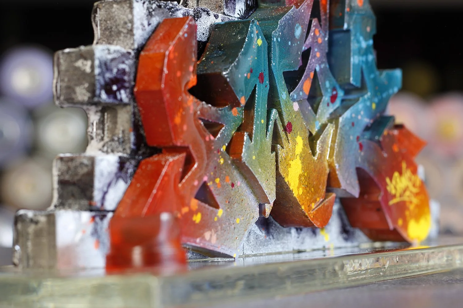Each unique sculpture combines resin, cement, and 3D-printed elements in a materially layered construction. Drawing from the language of street walls and urban surfaces, it translates the immediacy of street art into three dimensions.