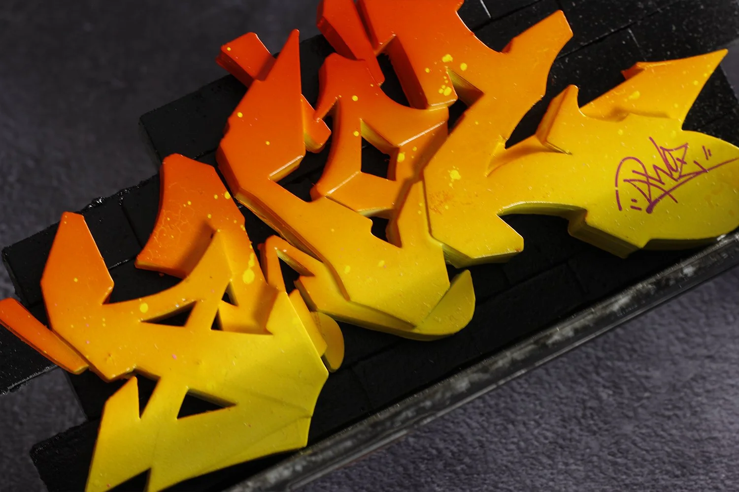 One side presents bold orange and yellow 3D-printed graffiti against a deep black wall, a striking contrast that immediately commands attention.