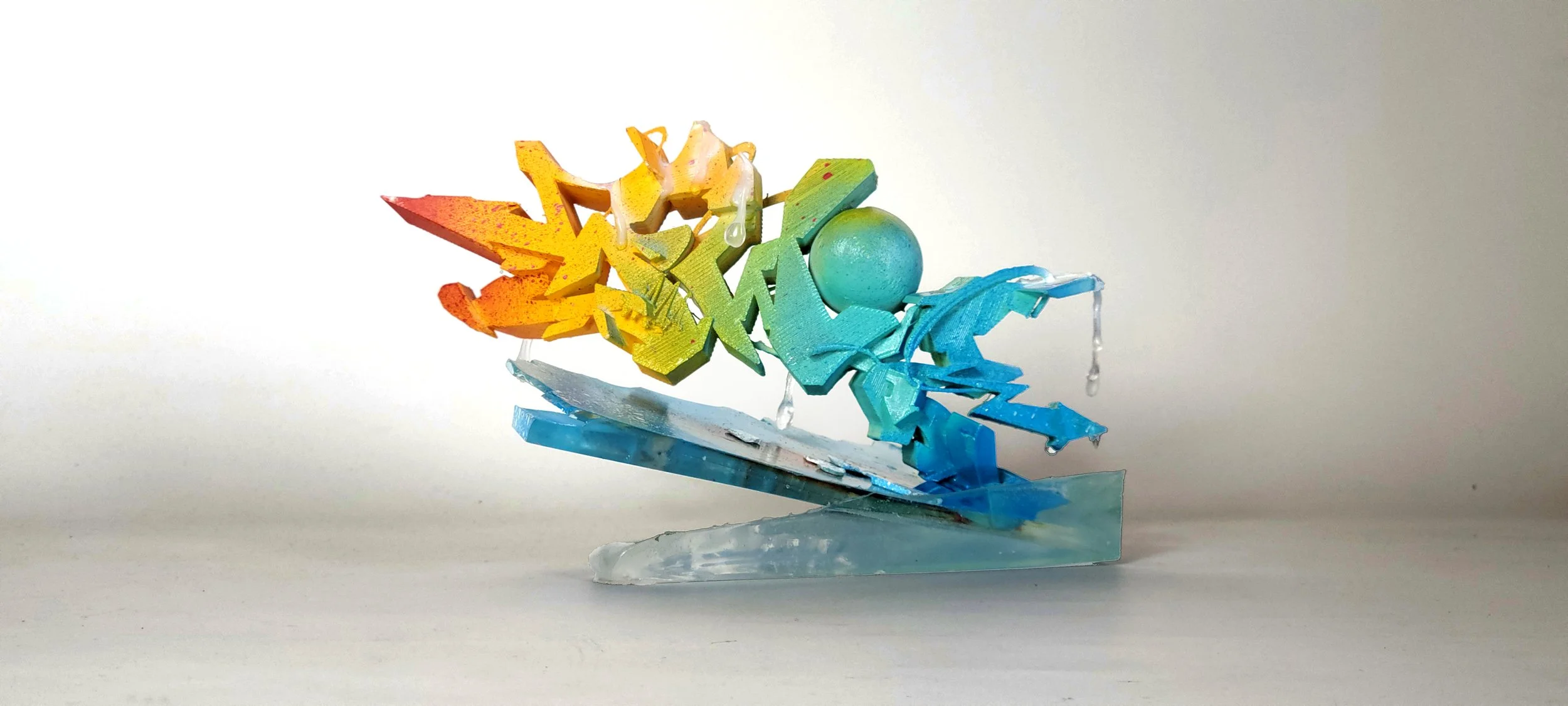 This piece features a striking visual representation of melting ice caps, with forms that mimic the flow of water-symbolizing rising sea levels. Always with a strong graffiti influence this sculpture is certain to make an impact.